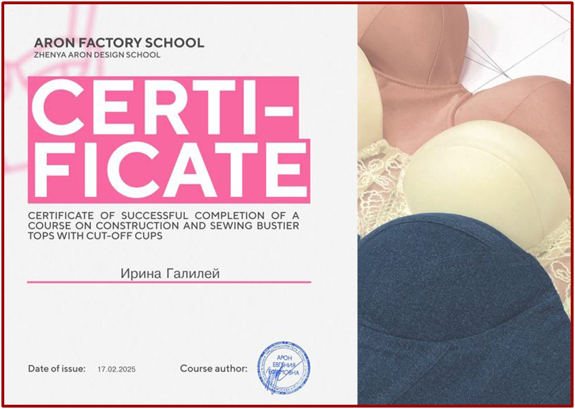 Одним из важных этапов стало успешное обучение в московской школе конструирования одежды Aron Factory School (Жени Арон), где создают наряды премиум-класса для звезд шоу бизнеса. Обучение прошло на отлично, и сегодня изделия Ирины вызывают настоящее восхищение. Они не просто красивы – они пробуждают у людей желание самим прикоснуться к волшебству пошива и создания одежды.
